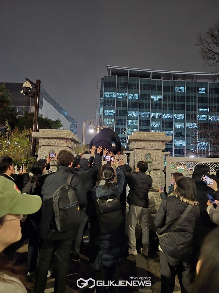 Assuming this picture is legit, it shows South Korean civilians helping a parliament member OVER A WALL so he could get into the building and vote to overturn martial law