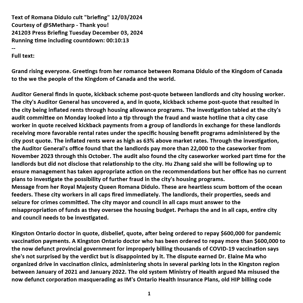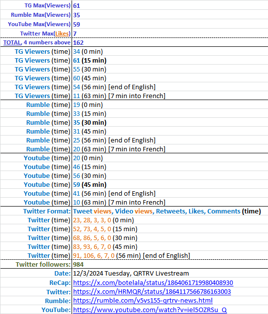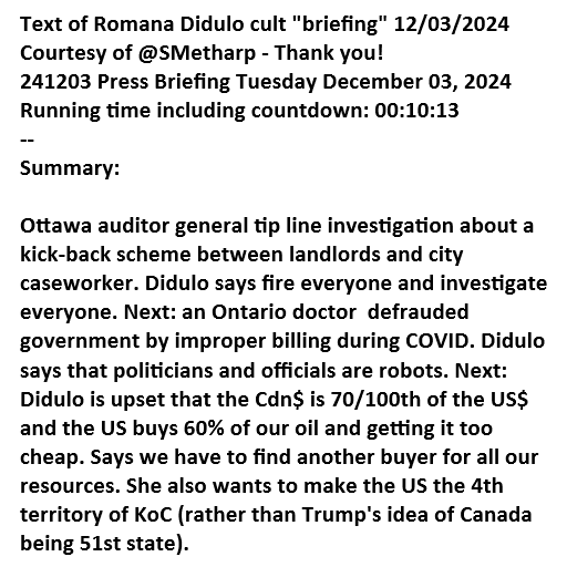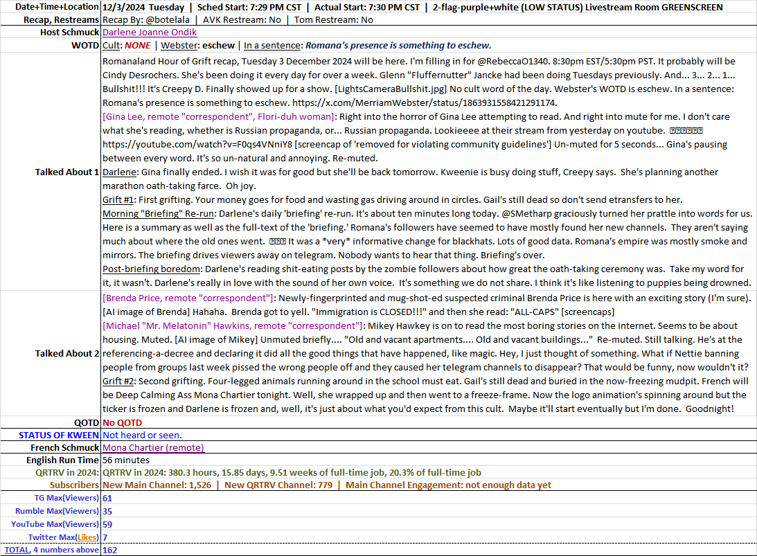 @RebeccaO1340 Tuesday 3 December 2024. A pretty boring cultcast, but then they almost all are. 56 minutes, 10 minutes of it briefing (telegram viewers fled). Creepy D finally showed up for a change. It wasn't any better. Thanks to @Mugginstoo for reliable data every day and @SMetharp for text!