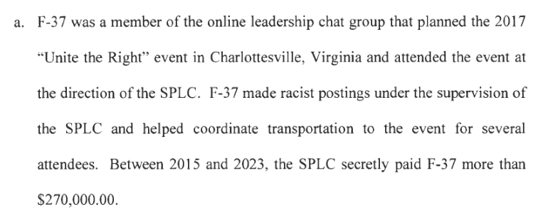 The paid informant at the "Unite the Right" rally in Charlottesville didn't just tip SPLC off. The SPLC supervised his r*cist postings and helped coordinate transportation, boosting the white nationalist side. SPLC paid him $270K between 2015 and 2023.