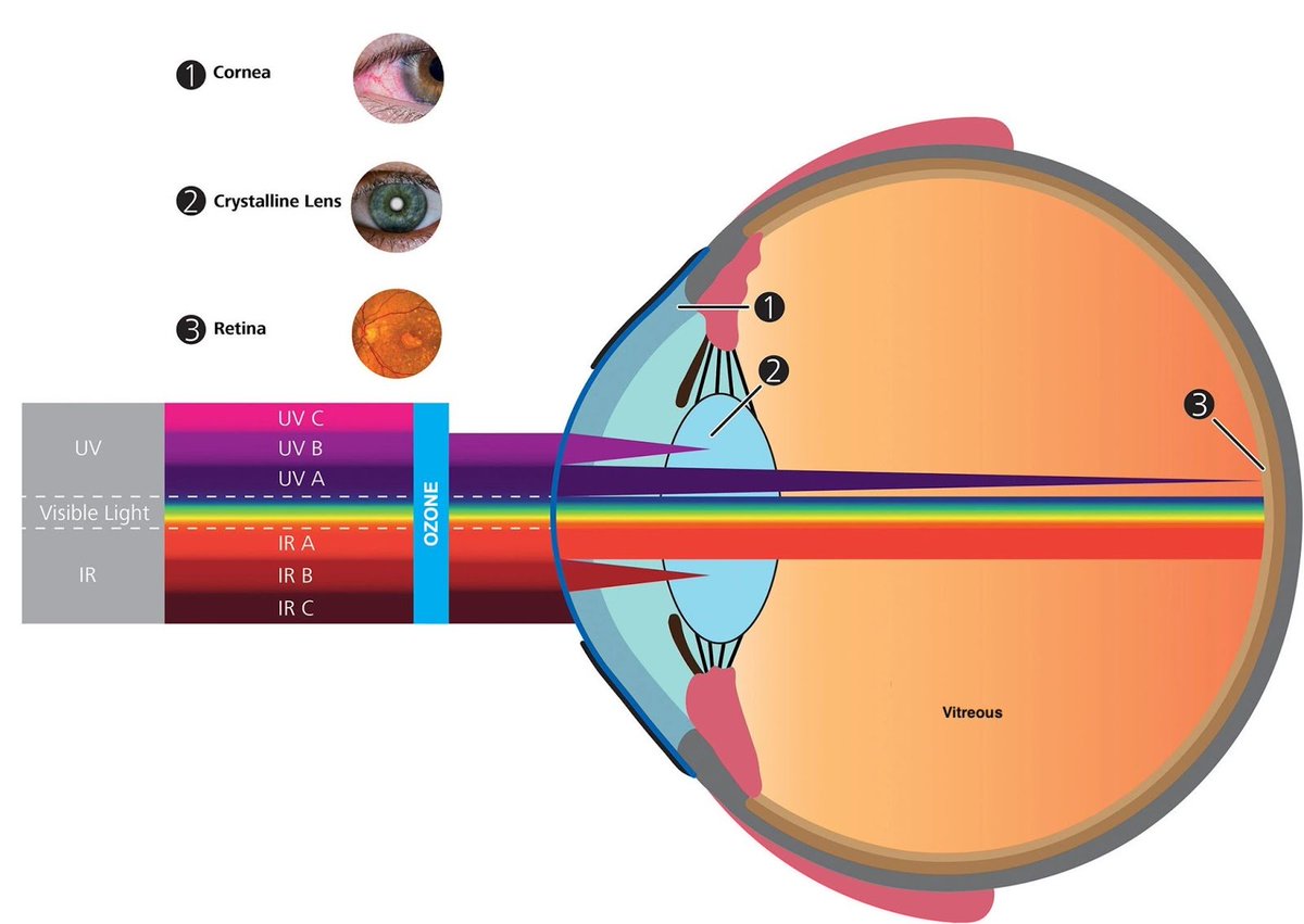 Blue light causes oxidative stress in the retina. Usually red light from the sun balances this harm from blue light.