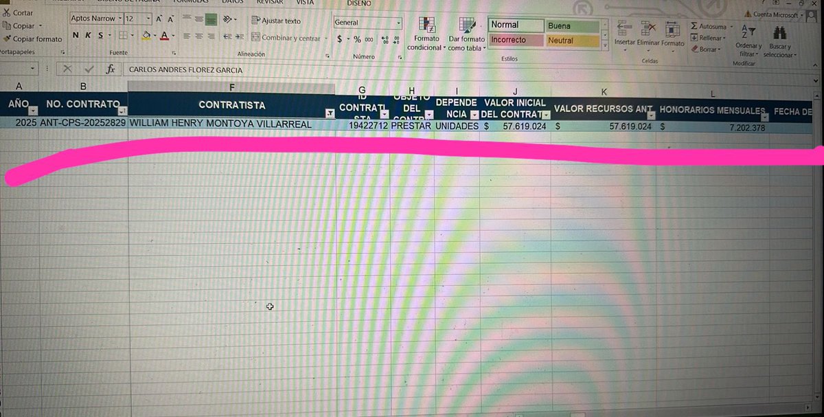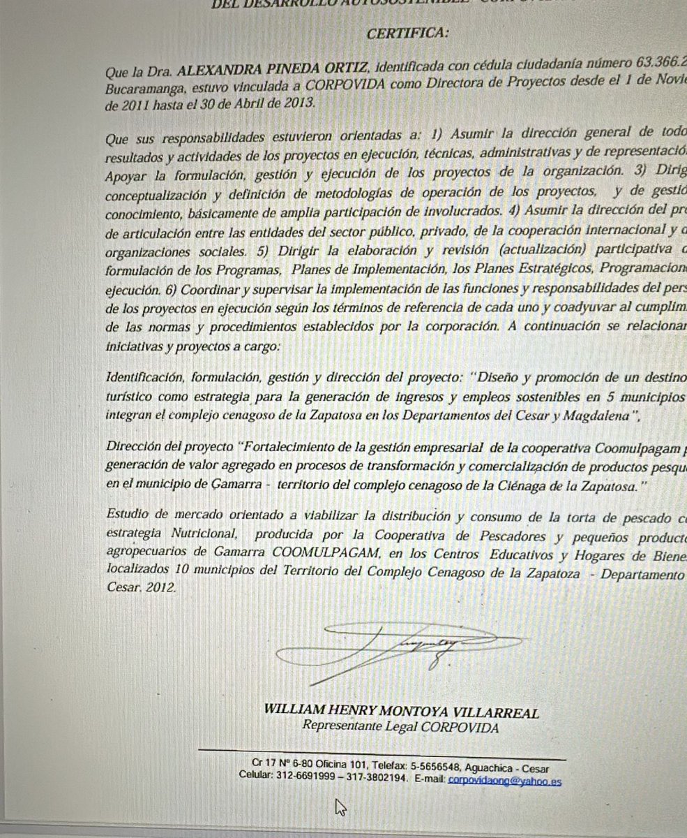Alexandra Pineda, al tener el control de la agencia, mete a todos sus familiares: a su esposo, William Montoya; a su hijo, Cristian Leonardo Montoya Pineda; a su prima, Alvis Luz Ortiz Rocha. Una víctima reclamante que pidió protección de su nombre. Me indica que a campesinos, presuntamente, les exigen entre 2 y 5 millones por estudios para adecuar los papeles. También están haciendo un censo de campesinos para que sean potenciales votantes de la próxima campaña a la Cámara de Representantes de Alexandra Pineda. Y hay más: William Montoya le da un certificado de experiencia a su esposa, Alexandra Pineda, para poder trabajar en la agencia.