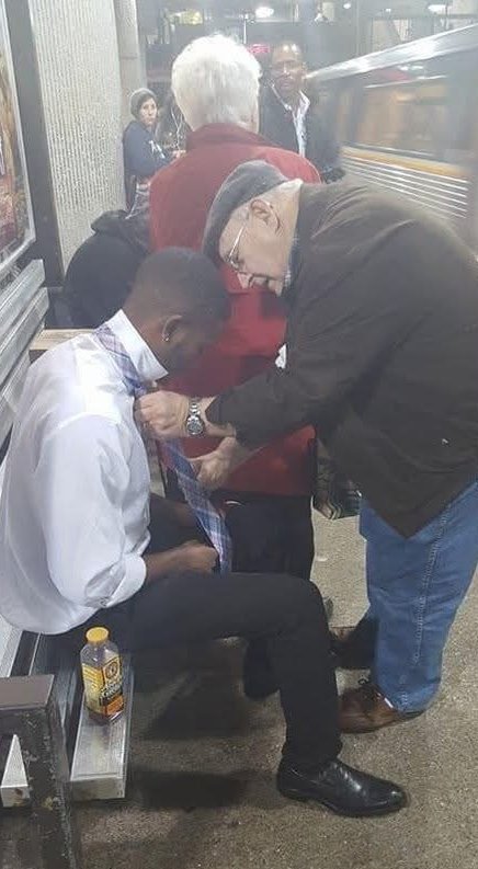 1. Este joven se dirigía a una entrevista de trabajo y tenía un pequeño problema con la corbata. La abuela del abrigo rojo se dio cuenta de que tenía problemas