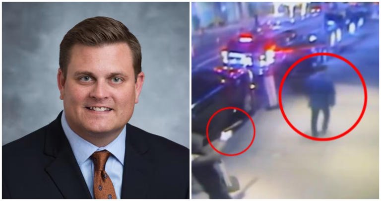 En las imágenes se puede ver cómo el asesino le dispara dos veces por la espalda, y el arma se traba.