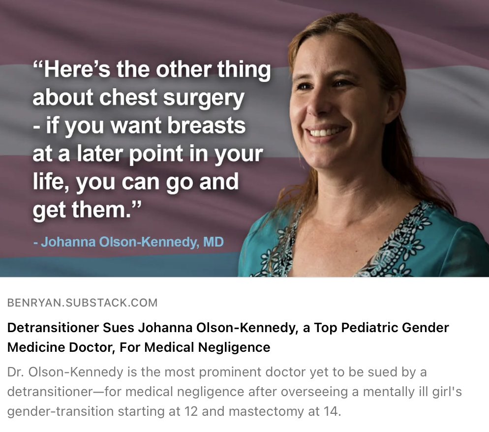 š§µ The plaintiff suing Johanna Olson-Kennedy reports having suffered from severe, worsening mental illness while Dr. Olson-Kennedy oversaw her gender-transition treatment, including a double mastectomy at age 14. Now a college student, she recently detransitioned. benryan.substack.com/publish/posts/ā¦