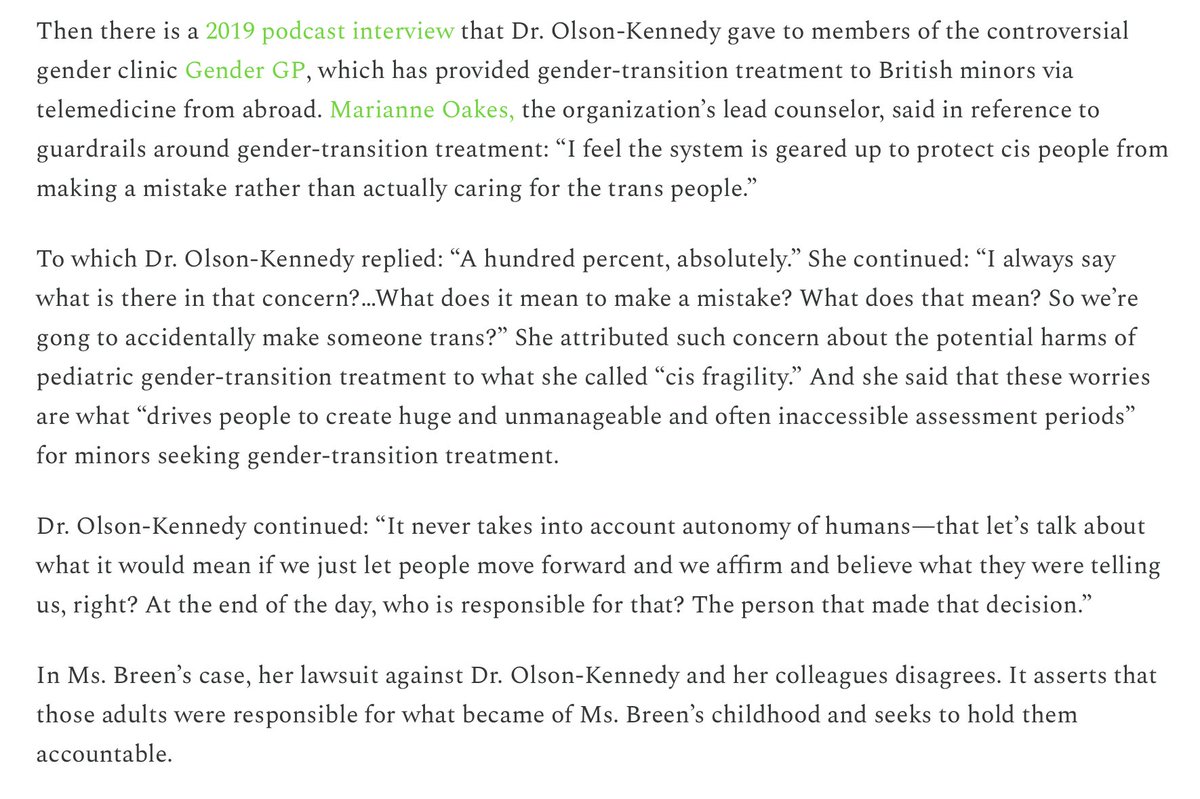 There is, for example, a 2019 podcast interviewĀ that Dr. Olson-Kennedy gave to members of the controversial gender clinicĀ Gender GP, which has provided gender-transition treatment to British minors via telemedicine from abroad.Ā Marianne Oakes,Ā the organizationās lead counselor, said in reference to guardrails around gender-transition treatment: āI feel the system is geared up to protect c-s people from making a mistake rather than actually caring for the trans people.ā benryan.substack.com/p/detransitionā¦
