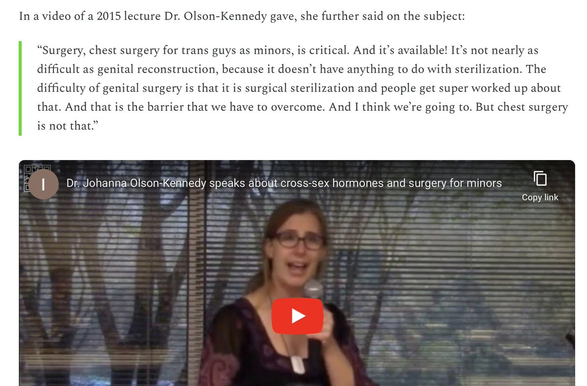 Dr. Olson-Kennedy continued: āIt never takes into account autonomy of humansāthat letās talk about what it would mean if we just let people move forward and we affirm and believe what they were telling us, right? At the end of the day, who is responsible for that? The person that made that decision.ā