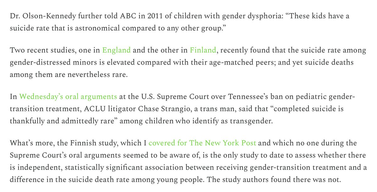 Whatās more, the Finnish study, which IĀ covered for The New York PostĀ and which no one during the Supreme Courtās oral arguments seemed to be aware of, is the only study to date to assess whether there is independent, statistically significant association between receiving gender-transition treatment and a difference in the suicide death rate among young people. The study authors found there was not.