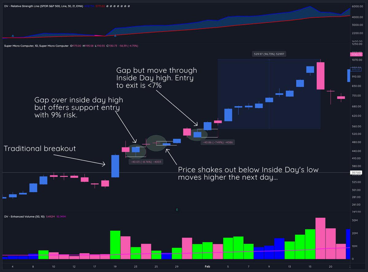 With this example, you can see that price hadn't necessarily broken out of a beautiful, multi-month base as it did with $NVDA or $SMCI.