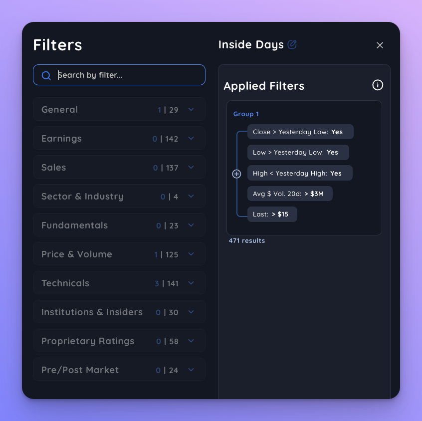 @Deepvue If you're a Deepvue member, you can easily run this scan by going to Screener, Presets, and then searching "inside day".