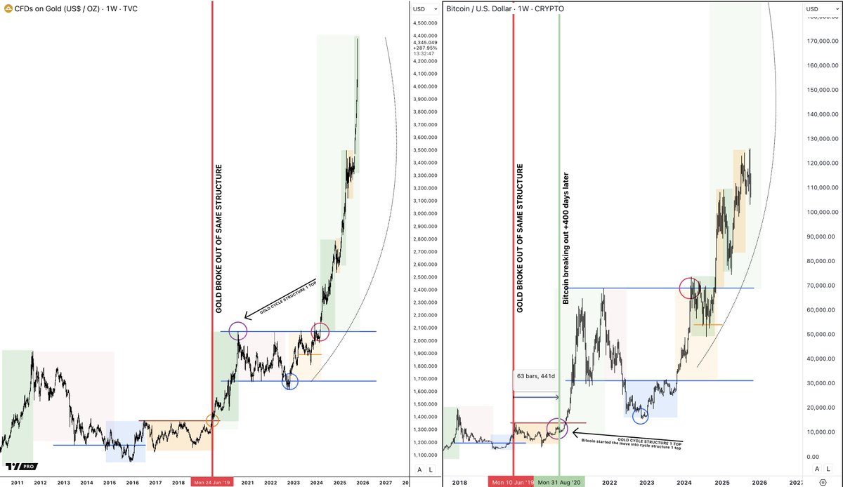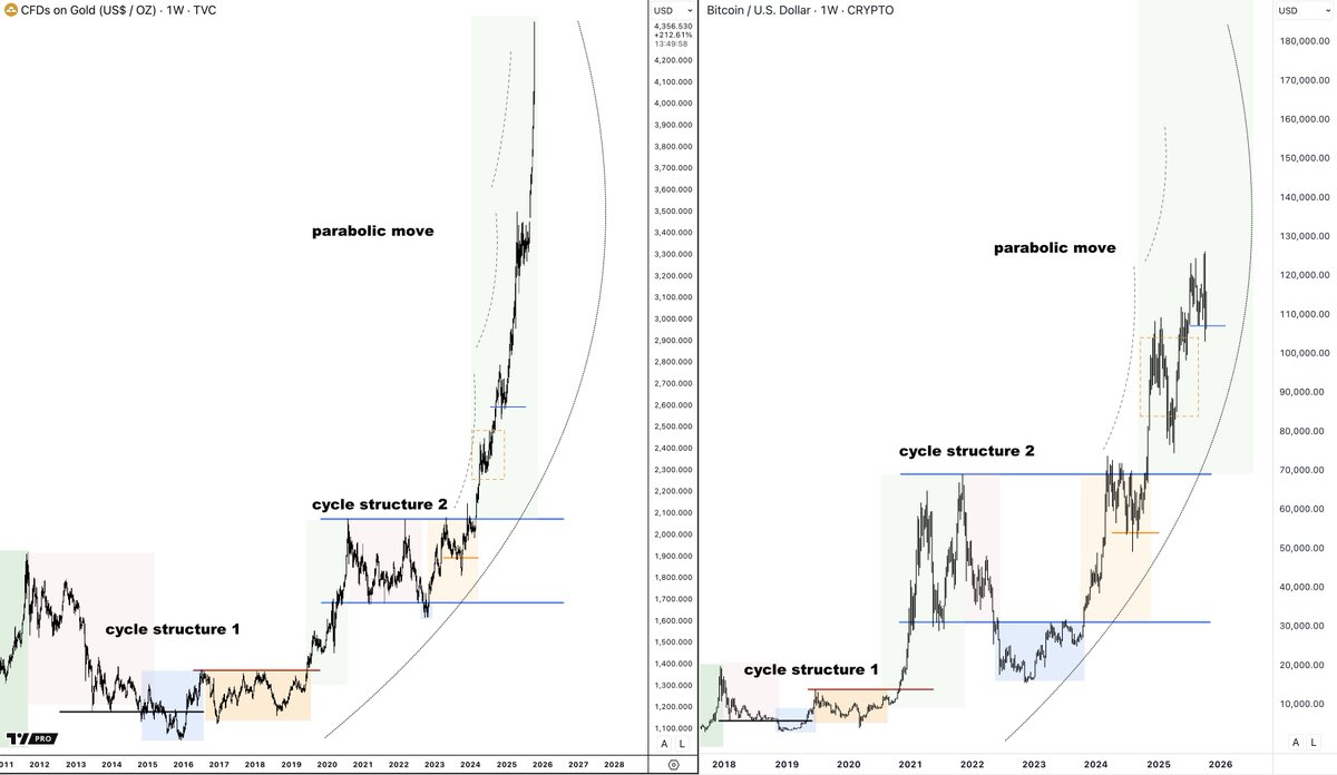 > Gold broke out of consolidation into the parabolic move, leading to the top 400+ days before Bitcoin broke out