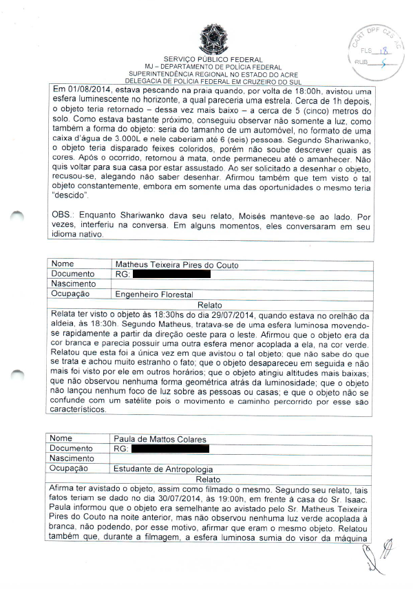 Um relatório com data de 29/09/2014 emitido pela Polícia Federal à Justiça, mostra a visão do órgão sobre as visitas de estranhos veículos e seres na Aldeia Apiwtxa, tribo Kampa do Amônia no Acre, onde a PF afirma que não é de sua competência tratar esse tipo de caso.