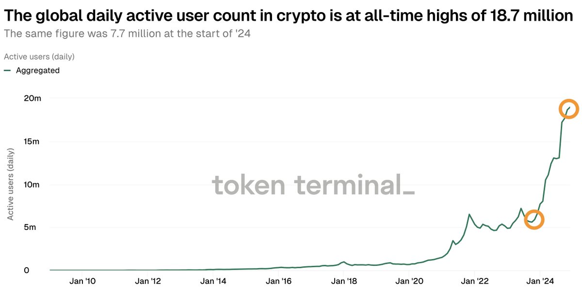▪️ The global daily active user count in crypto is at all-time highs of 18.7 million