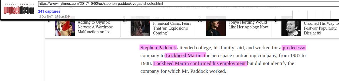 To start with the most well known connection, Stephen Paddock worked as an auditor for Morton-Thiokol, a predecessor company to Lockheed Martin and the manufacturer of the O-rings which failed on the NASA Space Shuttle Challenger, from 1985-1988