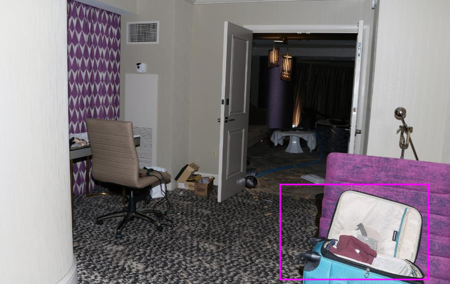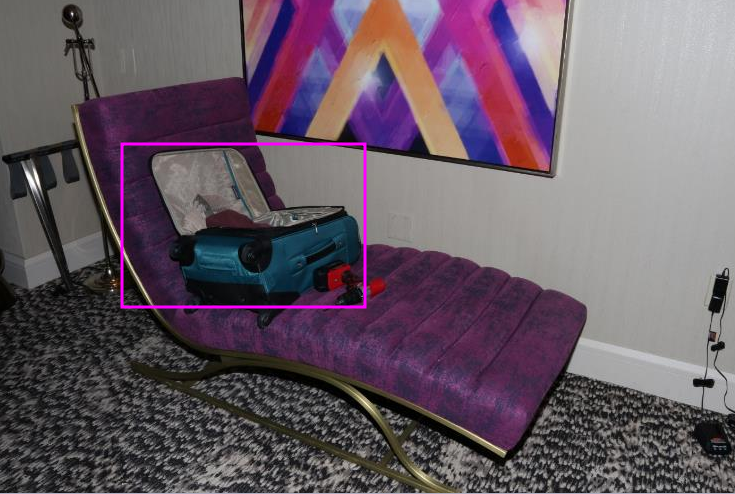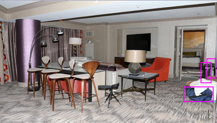 Breaking down the locations, in location A1 we have 1 duffel bag and 3 suitcases, since there is only one duffel visible in the FIT images we know A1 is near the entertainment center. However, in the images we only see 2 suitcases, one of which is missing.