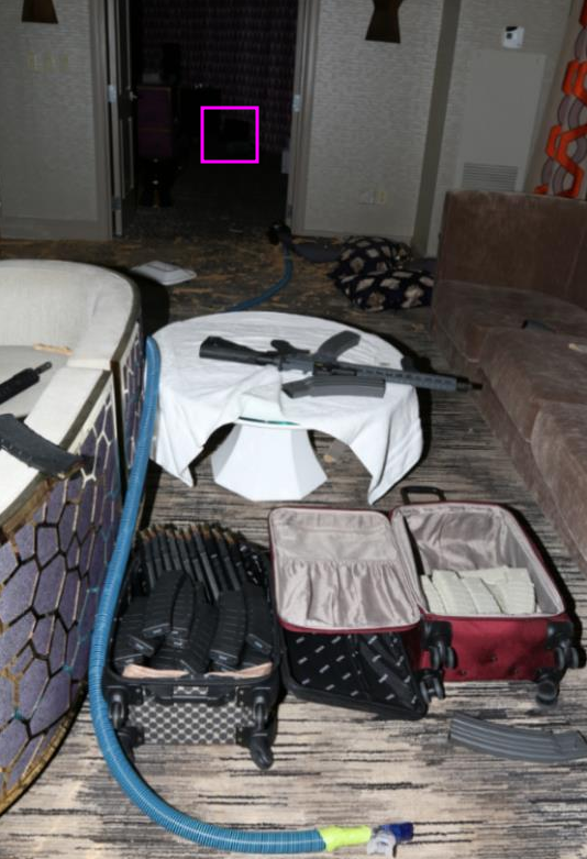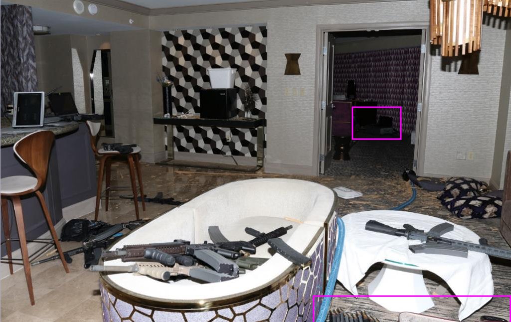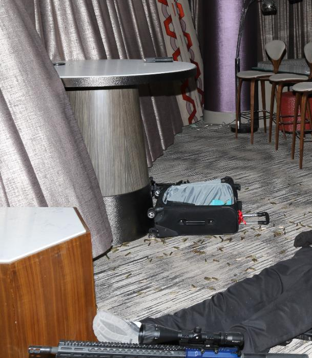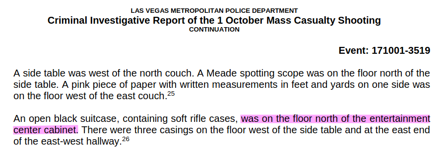 Vising the FIT report we see that they describe a suitcase in front of the entertainment center on the floor containing rifle cases. Why this suitcase is not imaged is unknown, but leaves room for speculation.