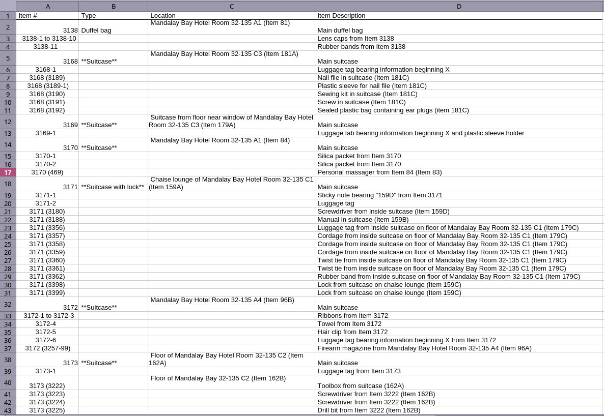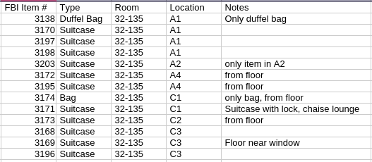Creating tables we can see 11 suitcases, 1 duffel bag, and 1 small bag were recovered which shows 1 extra suitcase not visible from the FIT images. Along with this, the FBI adds an item location for each piece of evidence which I have grouped together.