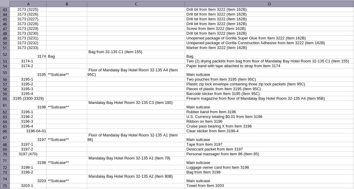 Overall, we can determine that the item in A4 is the "extra" item from the FBI report, with a definite total of 11 suitcases, one duffel-bag, and one small bag recovered from the crime scene.