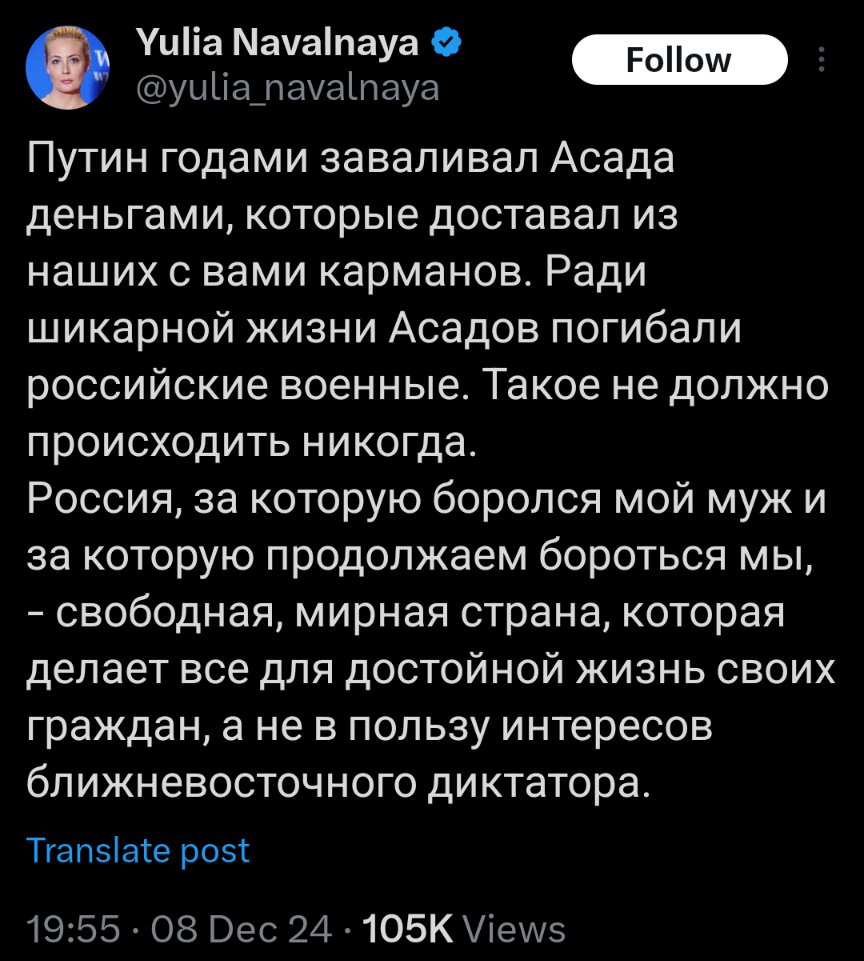 I find it mildly amusing how Navalnaya has reacted to Assad's "resignation". Her message to her English-speaking audience is like a party toast. For all the good against all the bad. Cheers-cheers.