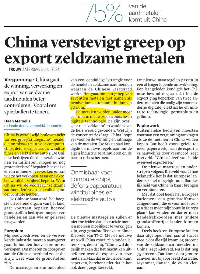 3/grondstoffen. Daarmee verliezen westerse landen de toegang tot die grondstoffen. En China vergroot e greep op zeldzame aardmetalen, die nodig zijn voor energietransitie, computerchips etc. 75% van de aardmetalen komt uit China. Ook over elders winbare grondstoffen heeft China