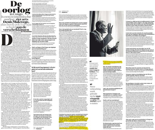 5/Over dat blind zijn voor de omstandigheden waaronder kritieke grondstoffen worden gewonnen, zei de Congolese gynaecoloog en Nobelprijswinnaar Denis Mukwege:‘Uit Congo komt 70% van kobalt en coltan. Die worden gedolven door mensen die worden behandeld als slaven.Massaverkrach-