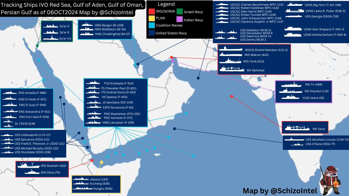 06OCT2024 Updated map of warships operating in Red Sea, Gulf of Oman, Gulf of Aden, Persian Gulf, Arabian Sea.
