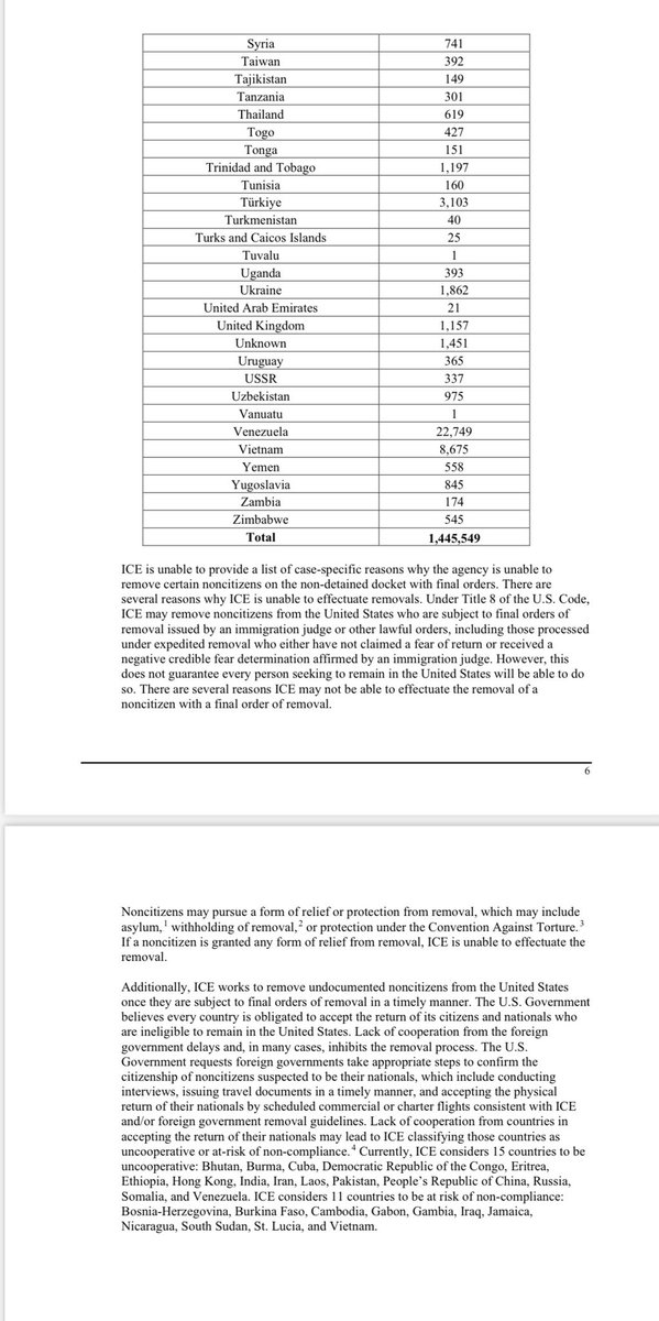 The data shows the number of illegal immigrants on ICE’s non detained docket w/ final orders of removal is 1,455,549 as of late November, the same number we previously reported via ICE sources. On the final page, ICE explains why they can’t remove everyone who had been ordered deported.