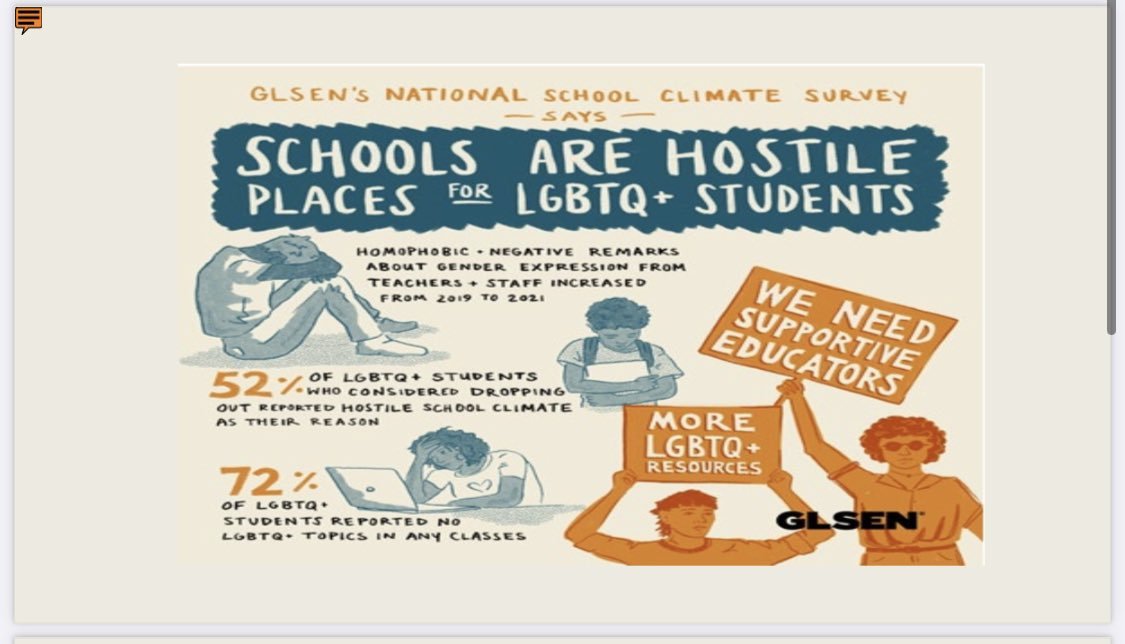 The presentation asserts that “schools are hostile places for LGBTQ+ students.”