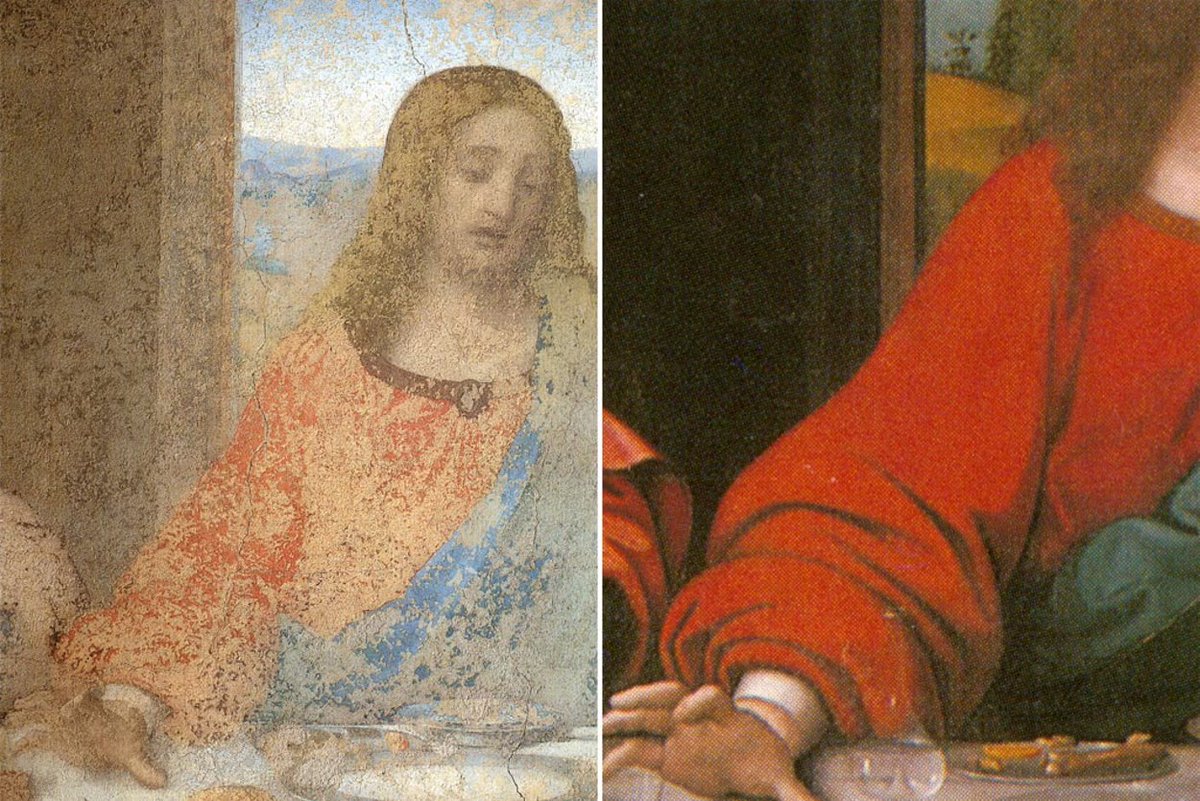 As we can see from a copy of the original made by a pupil of Da Vinci (right), the restoration moved Christ's sleeve atop the table, not beneath it.
