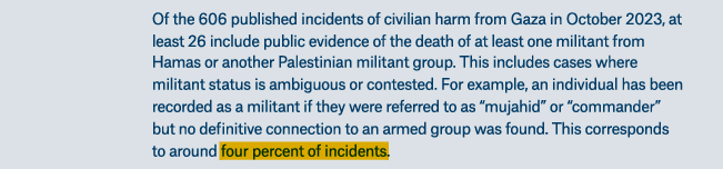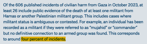 12/20 Israel says it kills civilians behind whom combatants hide. But in October 2023, for 96% of incidents (IAF airstrikes for the most part) resulting in civilian death, 0 militants were killed.