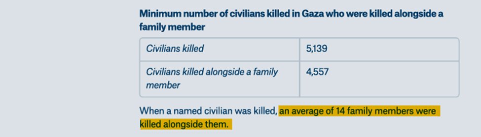 These include the fact that when one civilian was killed in an incident (again, overwhelmingly IAF airstrikes), an average of FOURTEEN family members were killed with him or her.