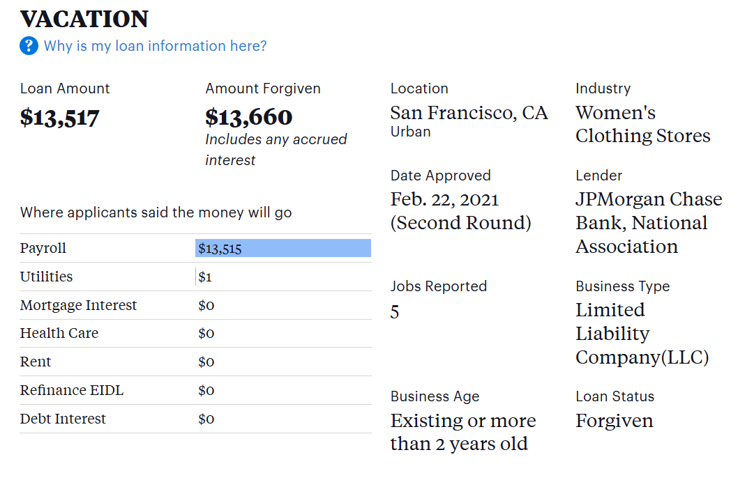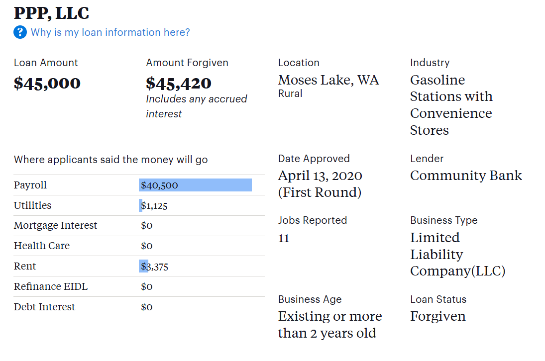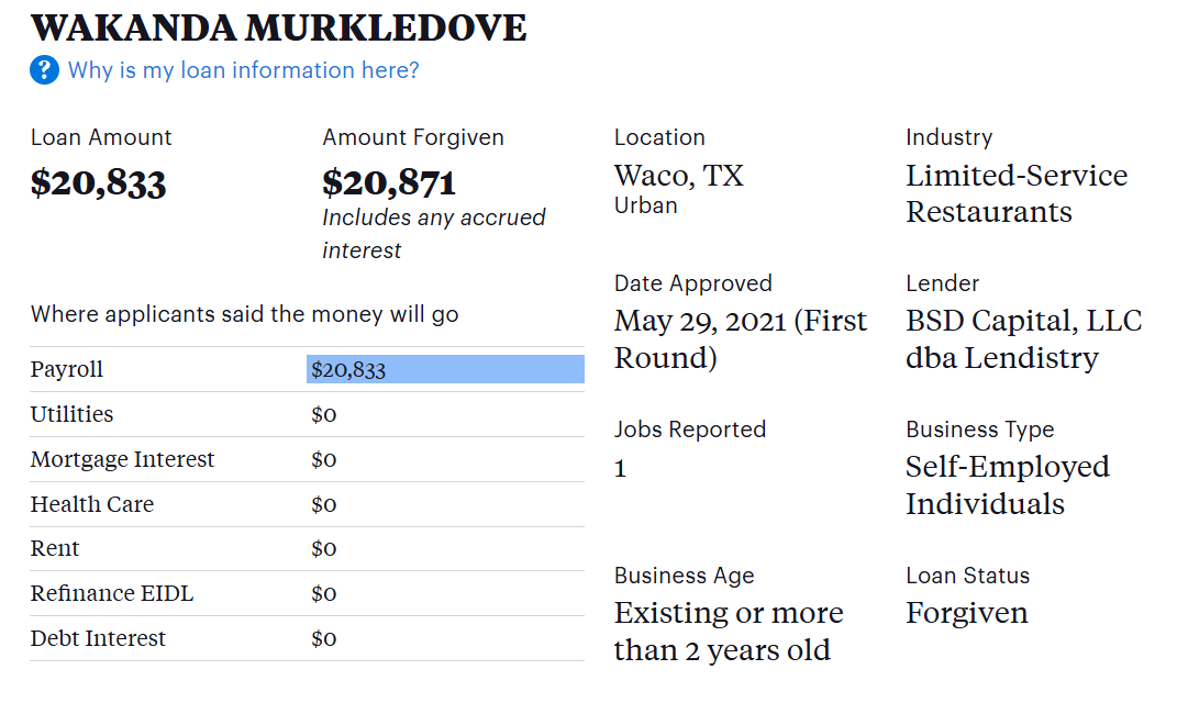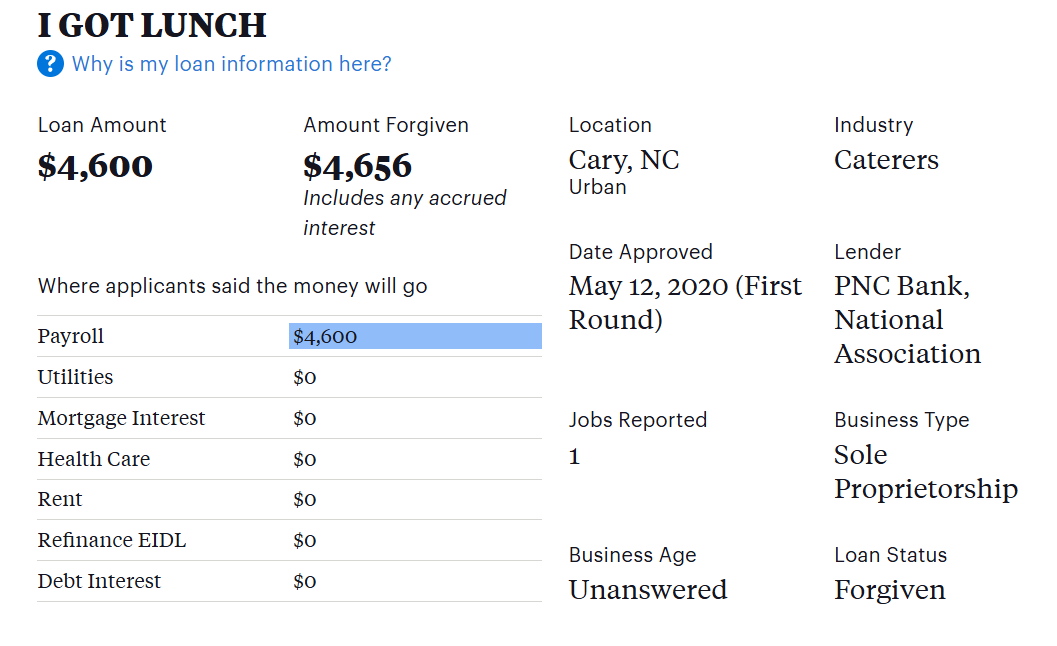 There are tons of businesses that have suspicious employee numbers (usually 1) and often enough, these suspicious loans were at the cap for sole proprietorships ($20,833), and they're addressed to wrong people.