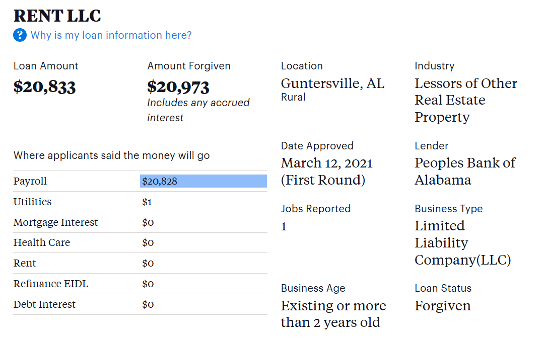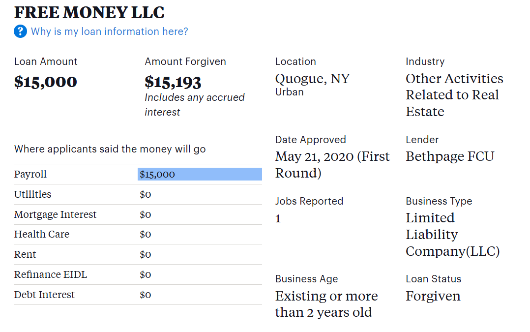 As a reminder in case you skipped over it, Free Money LLC had their loans forgiven.