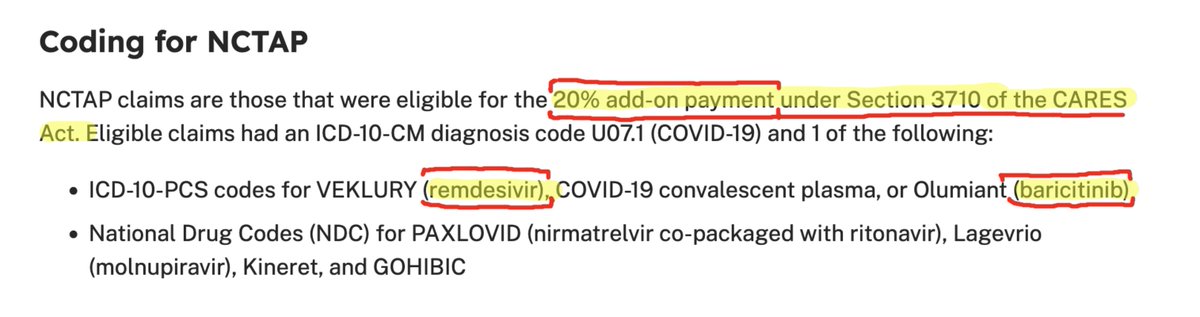 @VacSafety As Beaudoin notes in the clip, hospitals are rewarded a 20% "add-on payment" if they use VEKLURY (remdesivir) or Olumiant (barcitinib).