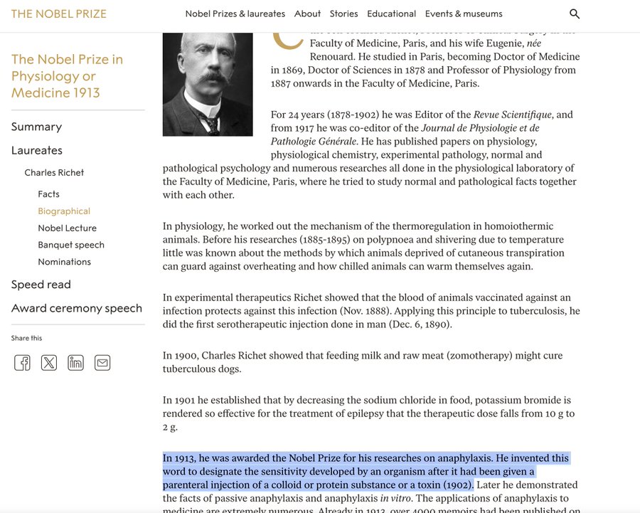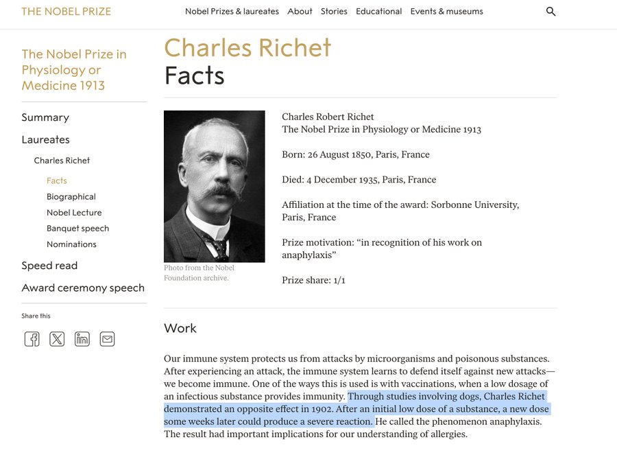 (3/9) Latypova highlights the work of Nobel Prize–winner Charles Richet, who found that when you inject things into the bloodstream—even benign proteins—you prime the body to have severe reactions to whatever was injected: