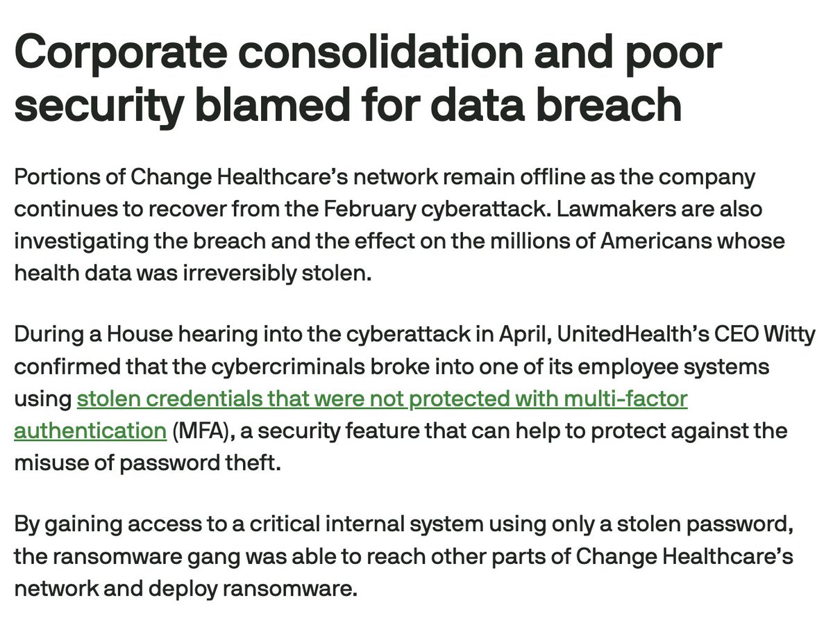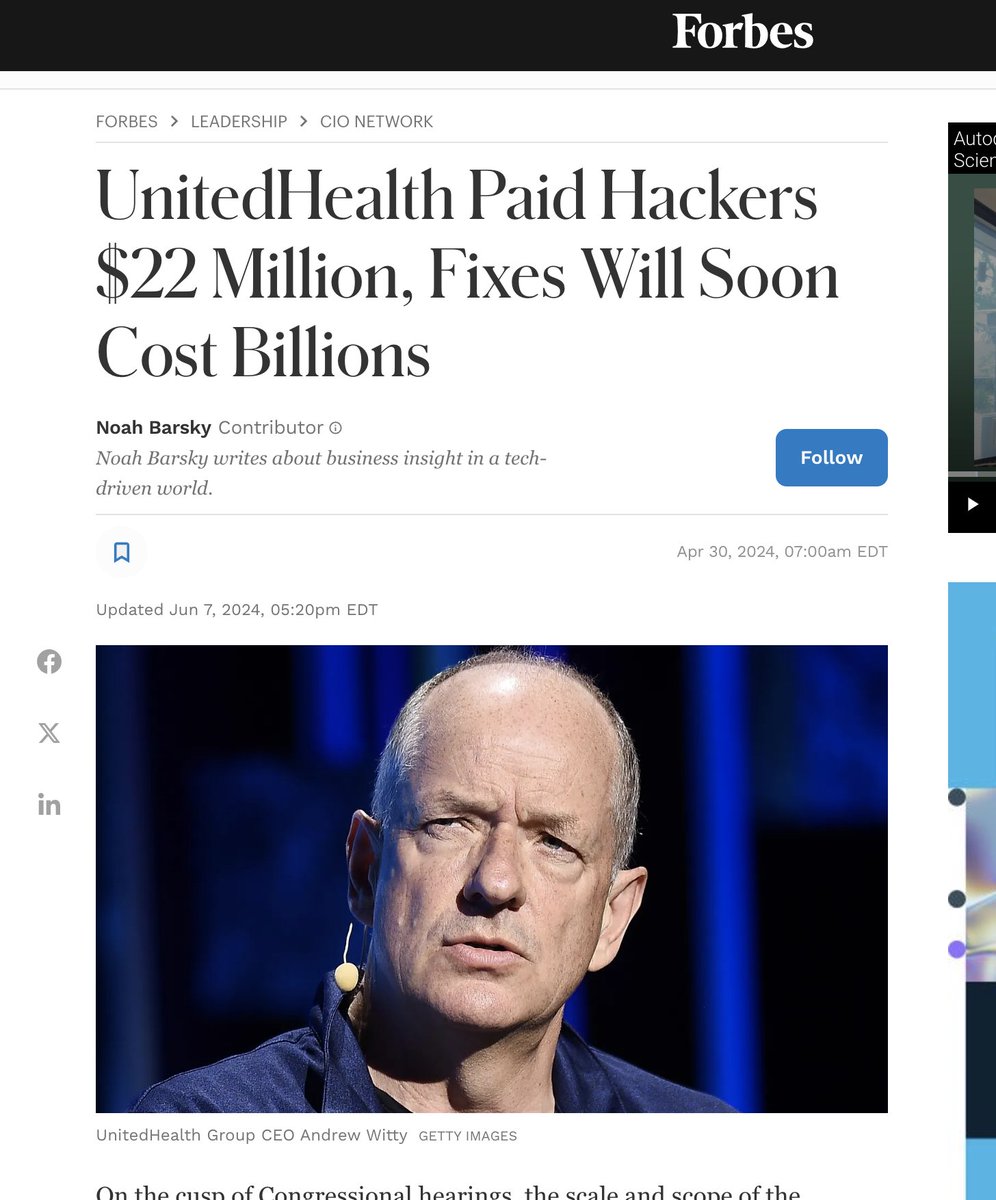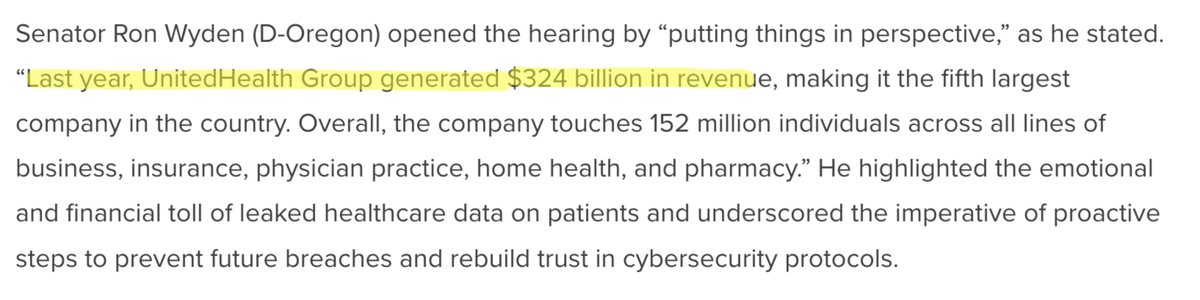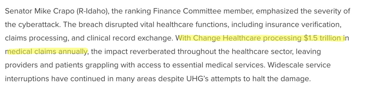 (2/6) In May of this year, UnitedHealthcare Group CEO Andrew Witty testified before Congress regarding the ransomeware attack. Change Healthcare, the hacked division of UNH, processes $1.5 TRILLION in medical claims annually.