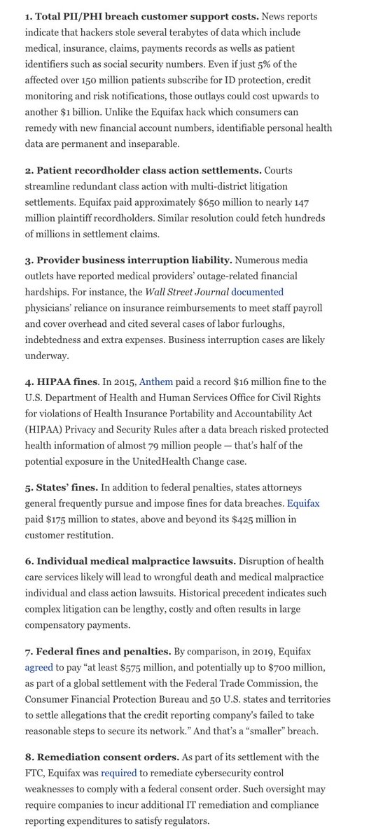 (3/6) UNH paid the hackers $22 million, but face untold billions in damages for many reasons, including customer-support costs, record-holder class-action settlements, HIPPA fines, state fines, etc.