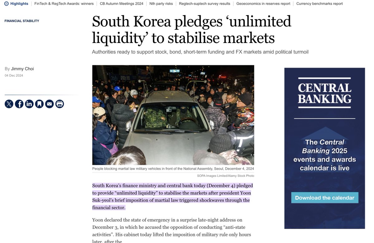 (3/6) On Dec. 3, S.K. President Yoon Suk Yeol ostensibly declared martial law in order to "eradicate 'shameless pro-North Korean anti-state forces.'" As Dowd mentions, central bankers have used the "brief" declaration of martial law as an excuse to "provide 'unlimited liquidity' to stabilize the markets."