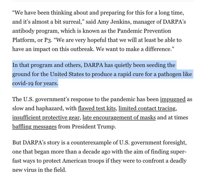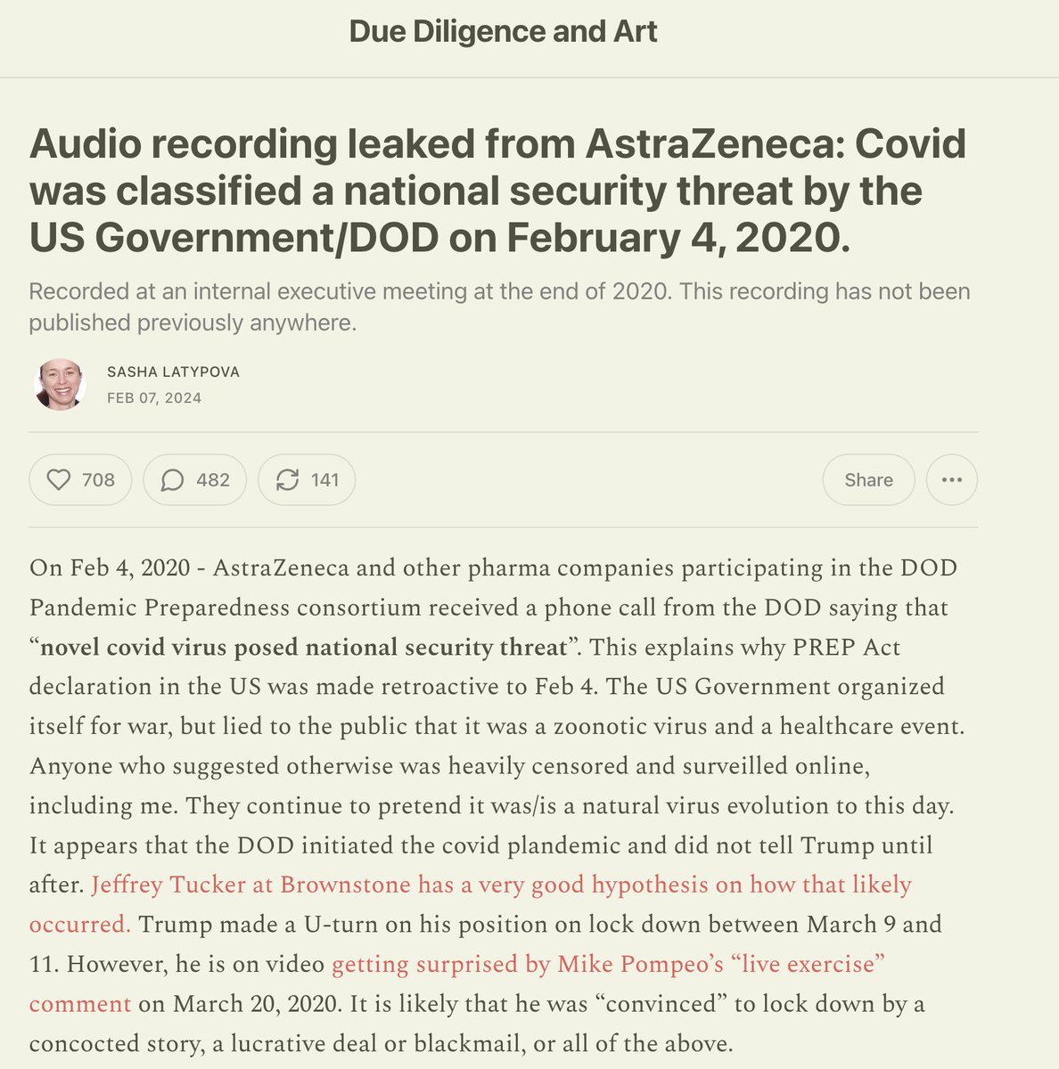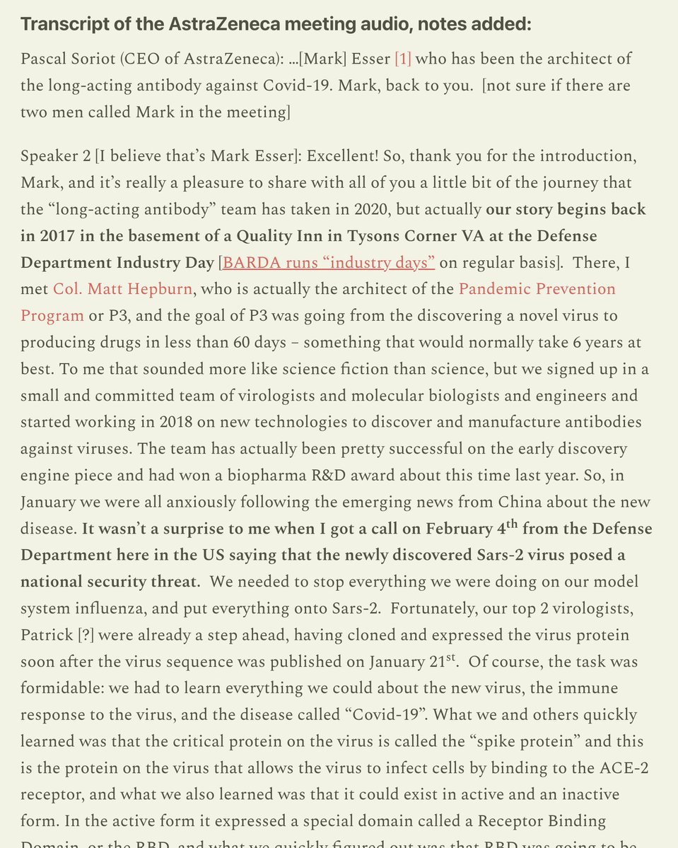 "On February 4th, there's a phone call—and this is...leaked audio from AstraZeneca executives. There was a phone call placed from the Department of Defense. I believe the person making the phone call was Colonel Matt Hepburn from DARPA," Latypova says. "And he called the consortium of pharmaceutical companies telling them to switch from previously funded pan-influenza ['vaccine'] models to COVID ['vaccine'] models because, and I'm quoting him, 'COVID was declared a national security threat.'" (See tweet 16/17 for supporting evidence.)