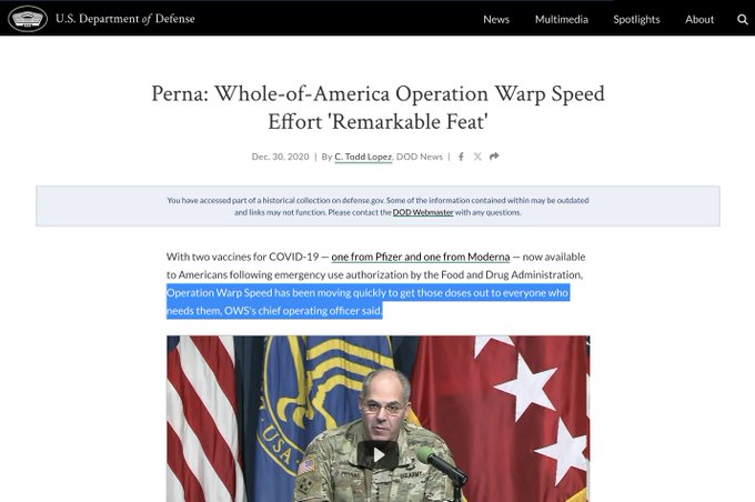 "What's more interesting...we have a whole series—hours—of Department of Defense press conferences at the Pentagon with media, over the 2020/2021 timeframe, when they were working on Operation Warp Speed. And so they would do these periodic press updates, and they're hilarious and very interesting....I don't recall the date exactly right now, but it was somewhere [in] February, early March, there [was] a press event where, there's Colonel Wendy Sammons-Jackson and a few others. So there's General [Michael J.] Talley, who leads the presentation from the DOD, and there are two or three [other] participants from Fort Detrick, the biolab and, the US Army infectious disease research. And they're all discussing this stuff. And so she [Sammons-Jackson] says specifically, 'Oh, we've received...the pathogen, meaning the COVID virus... and we [meaning the DOD] are growing the stocks of it." (See tweet 2/17 for supporting evidence.)