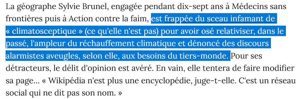7e GROSSE erreur, sur le cas de Sylvie Brunel : si elle est qualifiée de "climatosceptique", c'est avant tout car des climatologues sérieux la qualifient comme telle.