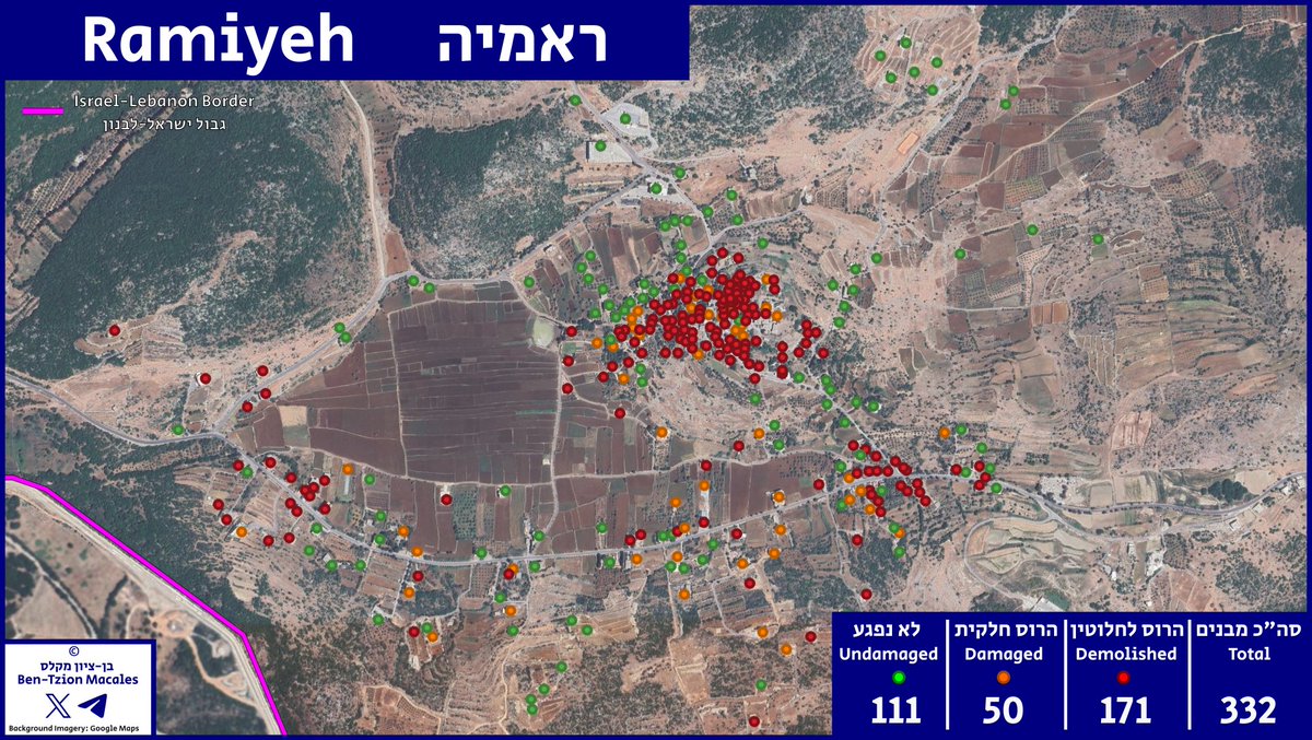 These are the villages where IDF Divisions 98, 91, 36, 146, and 210 maneuvered to destroy enemy capabilities. 1. Over than 6,000 buildings (some are not included in the thread) were damaged with moderate to severe impact during the ground maneuver in October and November. More than a third of all buildings in the first line. The number could get higher when burnt-out buildings are included. 2. Many buildings that were destroyed were found on controlling hilltops, main routes, or village cores. 3. All buildings within a few hundred meters from the border were demolished. 4. Villages with a predominantly Muslim Shiite and Sunni population were significantly more affected compared to villages with a Christian-majority population.