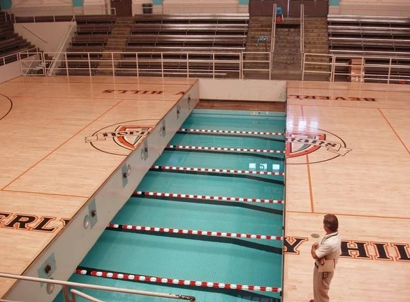 The high school dance sequence was filmed at Beverly Hills High School. It’s still there, and used by students, to this day. And the retractable floor was also used in a rom-com called Whatever It Takes in 2000, in a very similar scene.