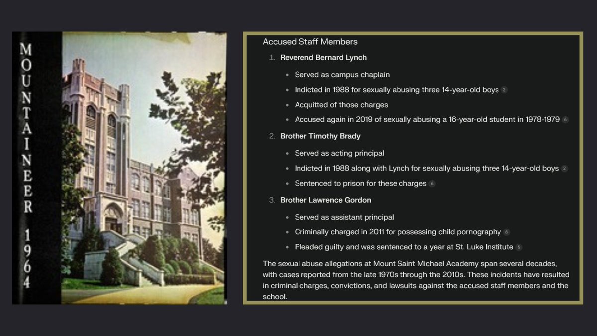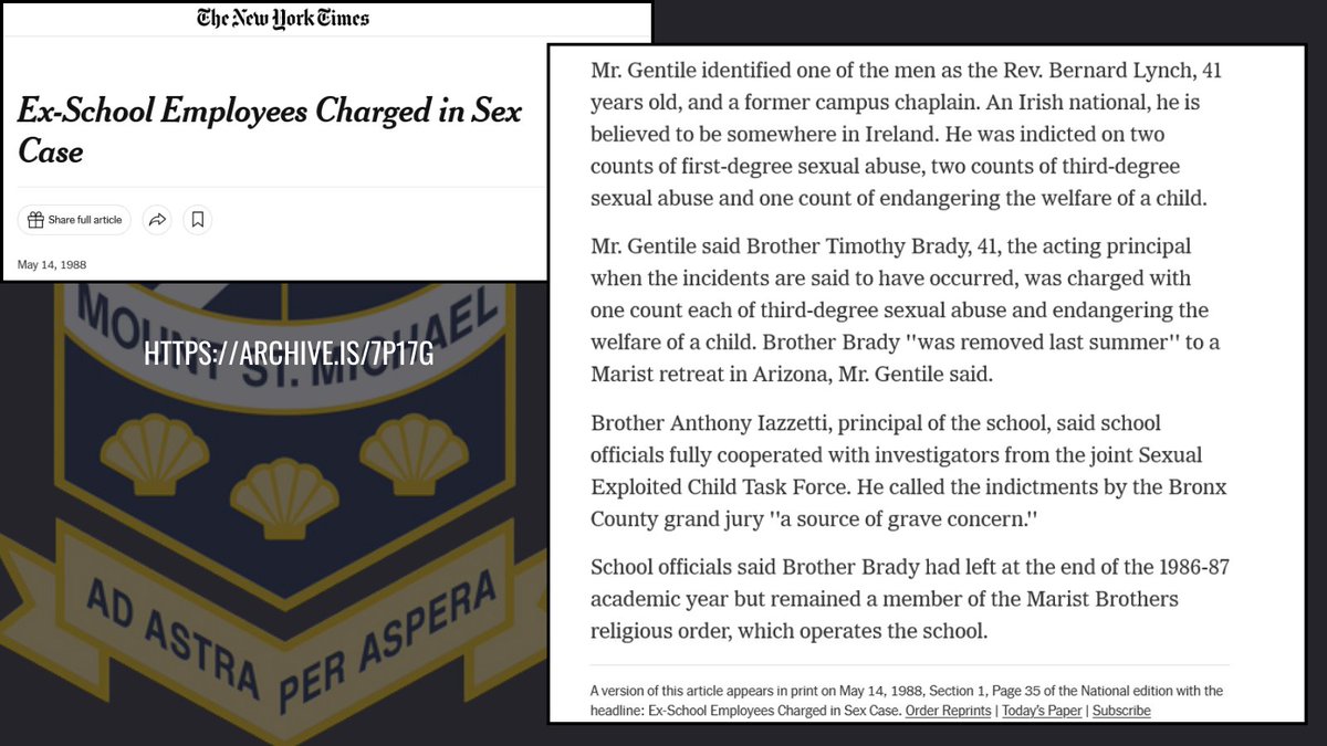 Principal Brother Timothy Brady who served at the school from 1980- til the end of the 1987 school year & was accused of abusing three boys in 1987—Combs’ graduating year—and Brady was subsequently arrested in 1988.