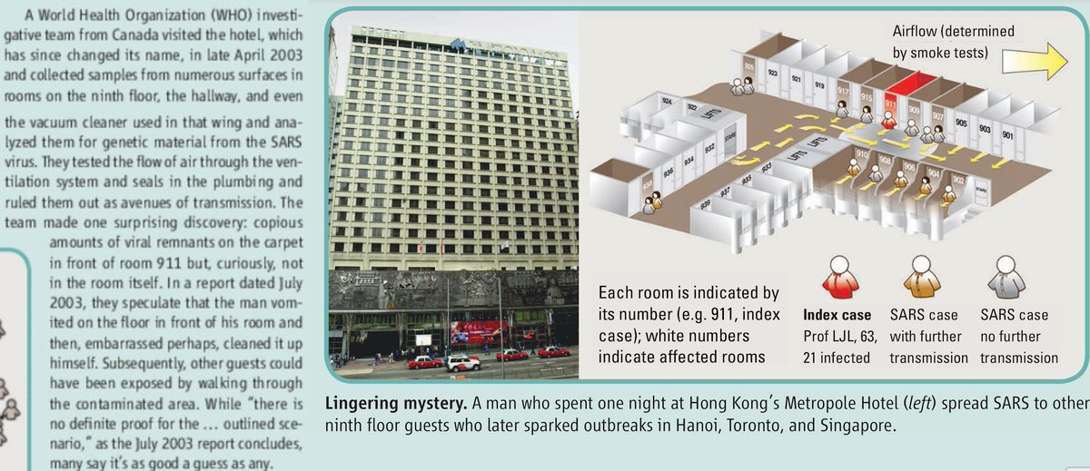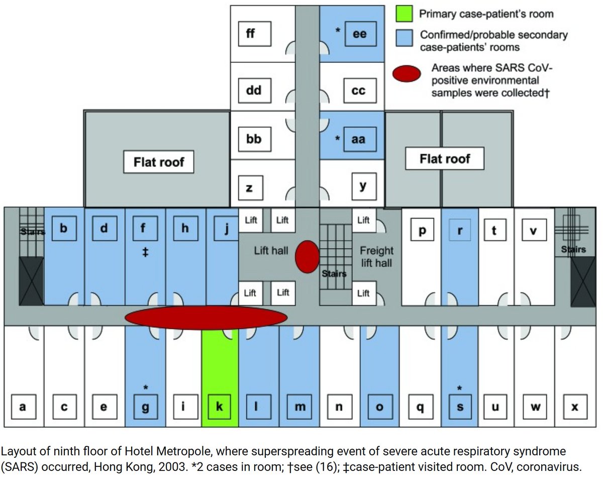 In the short time he was at the hotel, 19 other hotel guests were infected, all on the same floor. Four of these went on to seed outbreaks in Singapore, Toronto, Vietnam and elsewhere in Hong Kong, Three died, others had mild symptoms and infected no-one.
