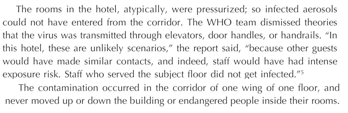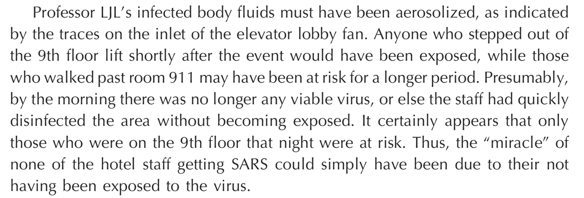 The WHO investigators realized the transmission must have been by aerosol. They speculated that Liu had vomited and perhaps staff cleaning vacuuming had aerosolized it.