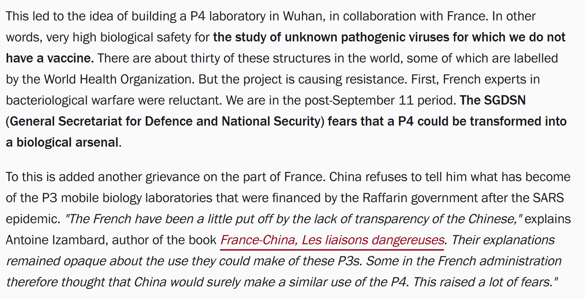 Zhu was the driving force behind the Wuhan P4, and became good friends with businessman Alain Mérieux, who promoted the project in France. The project was signed off by the Chirac government overruling warnings from French security forces about PLA interest in biowarfare.