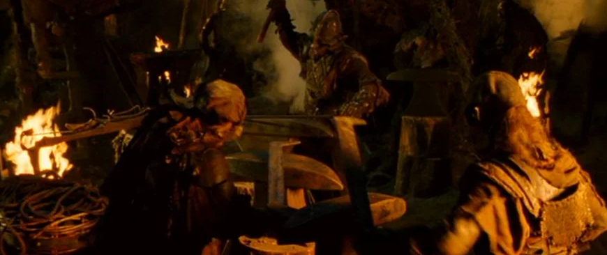 The Weta Workshop team show up in the film too. The Orc blacksmiths we see below Isengard (another miniature) were played by the Weta crew.
