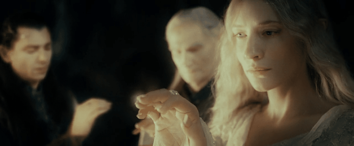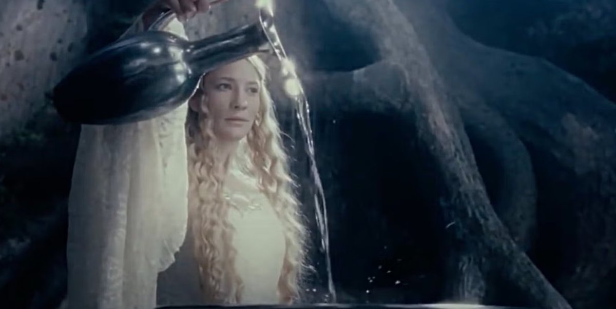 The moment Frodo looks into Galadriel's mirror and sees the Shire burning is a reference to The Scouring of the Shire, one of the final chapters in Tolkien’s Return of the King, where the Hobbits return home to find Hobbiton almost destroyed by Saruman.