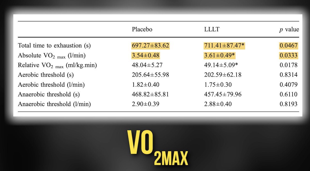 For example, in this human double blinded, randomized control, trial, red light therapy (low laser light therapy, LLLT) pretreatment before an exercise test on a treadmill increased endurance (time to exhaustion) and VO2max significantly 🏃♂️💪
