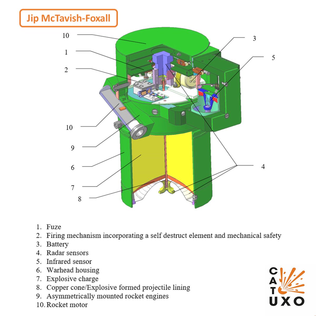 When the target is located an electronic fuze initiates the charge, firing an EFP capable of defeating most roof armor.